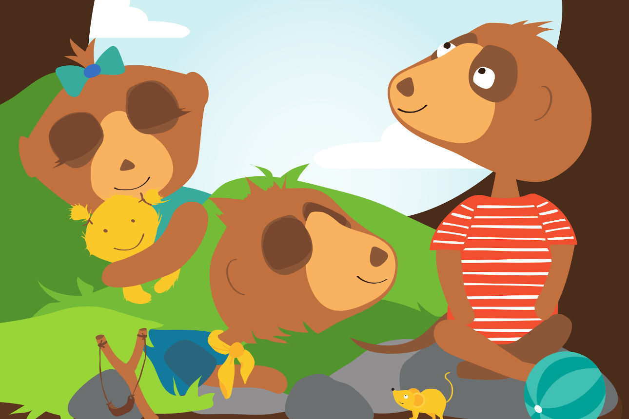 Il s’est réveillé très tôt. Son frère Félix et sa sœur Fiona ont les yeux encore fermés. Telle une grosse pelote de laine, ils dorment cachés dans le terrier des suricates.