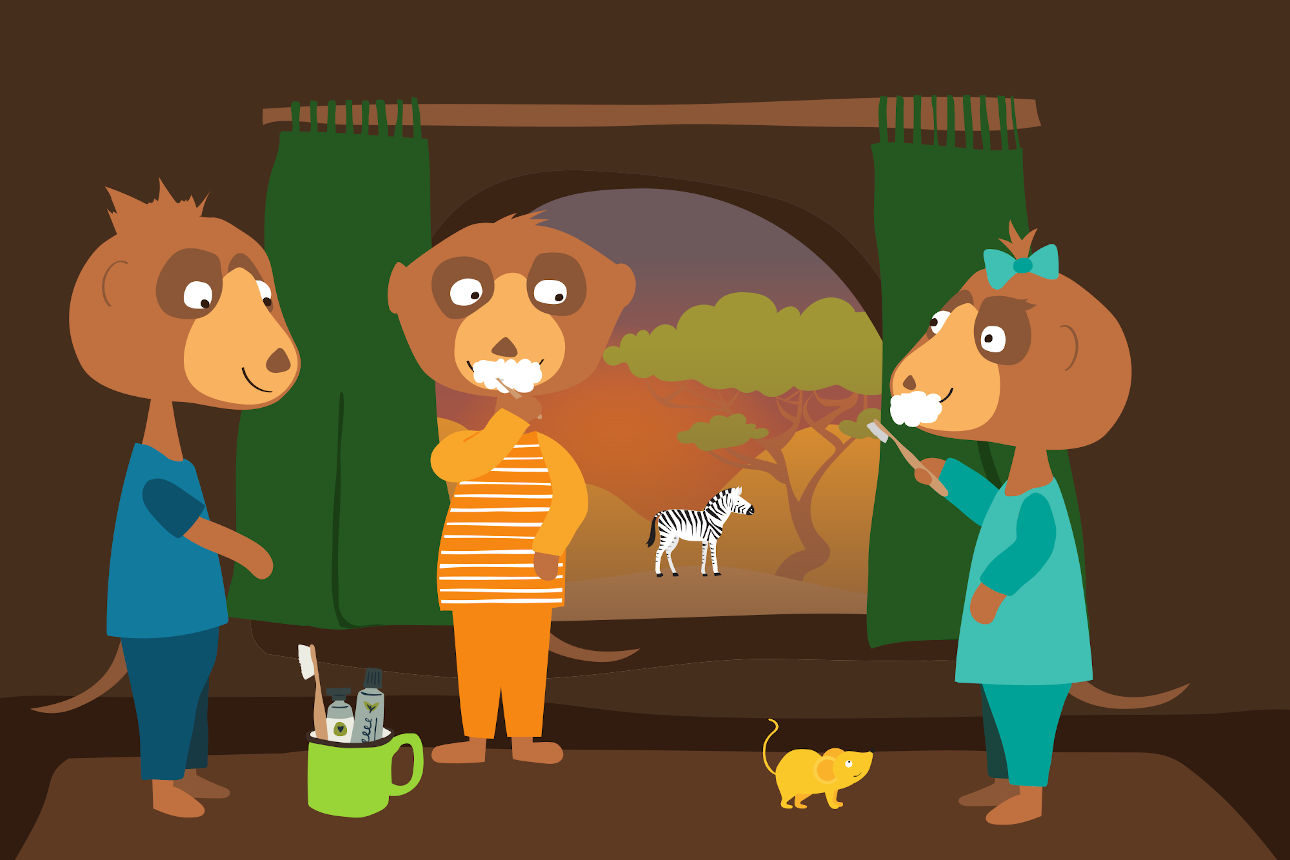 Maman suricate se tient sur un rocher et se met à siffler très fort. Félix, Franzi et Fips doivent rentrer à la grotte. Fips et ses frères et sœurs mettent leurs pyjamas, se brossent les dents et partent se coucher. Maman et Papa viennent leur dire bonne nuit. Pourtant, Fips n’est pas fatigué!