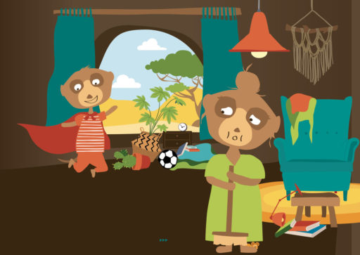 De plus en plus d’herbe de savane sèche commence à brûler. Le feu se rapproche rapidement du terrier du suricate. Que devraient-ils faire? L’incendie est trop loin du point d’eau. Impossible pour papa et grand-père d’éteindre le feu avec de l’eau.