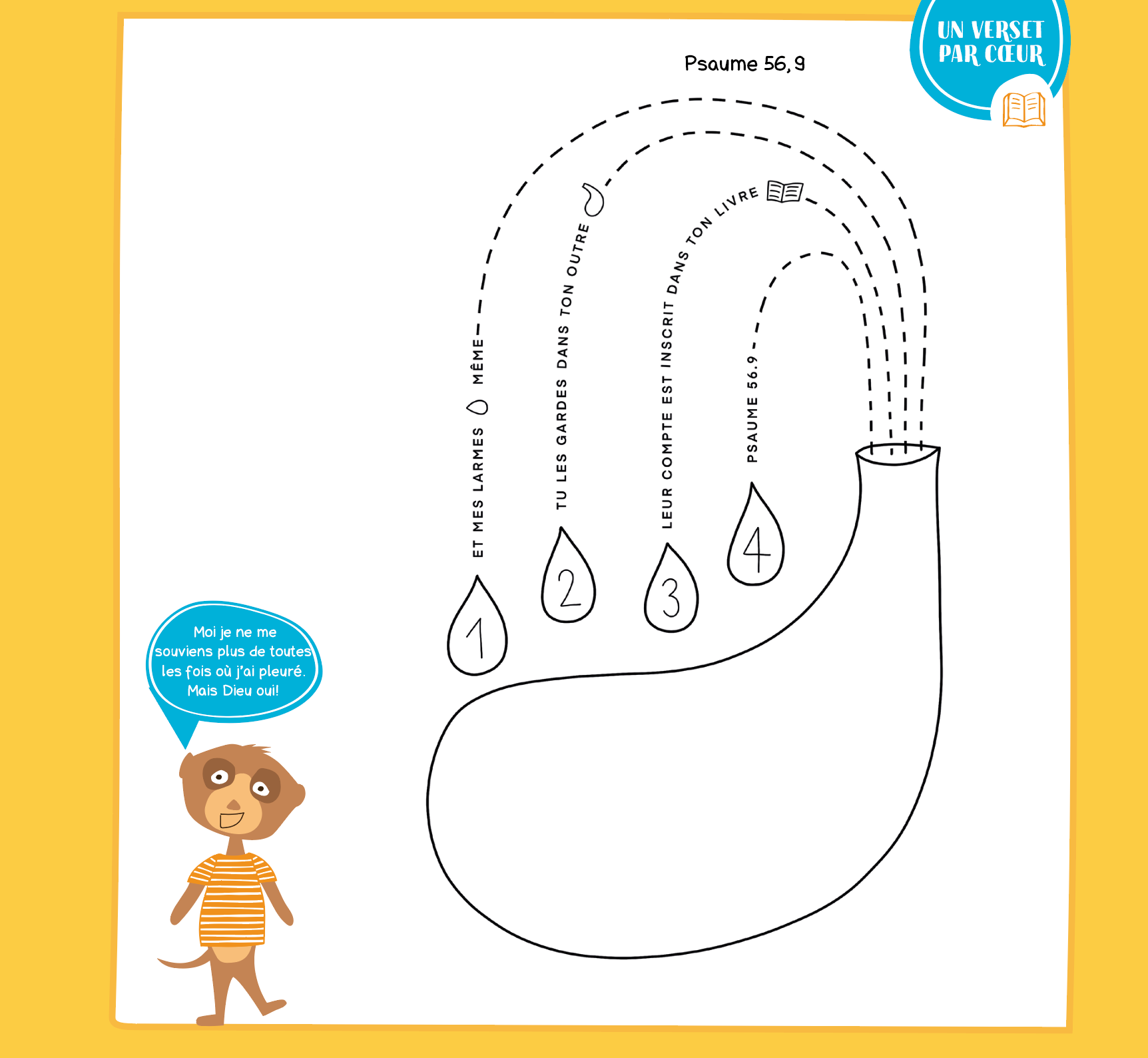 Prenez le temps avec vos enfants de parler de ce verset. Que représente une outre, par exemple? Certains textes bibliques nous encouragent à être dans la joie, cela ne veut pas dire que Dieu est insensible à nos larmes, à nos tristesses. C’est vrai pour nous, mais également pour nos enfants.
